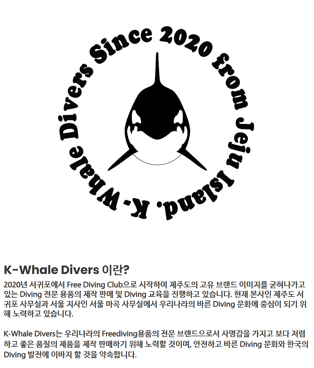 K-Whale Divers는 우리나라의 Freediving용품의 전문 브랜드으로서 사명감을 가지고 보다 저렴하고 좋은 품질의 제품을 제작 판매하기 위해 노력할 것이며, 안전하고 바른 Diving 문화와 한국의 Diving 발전에 이바지 할 것을 약속합니다.